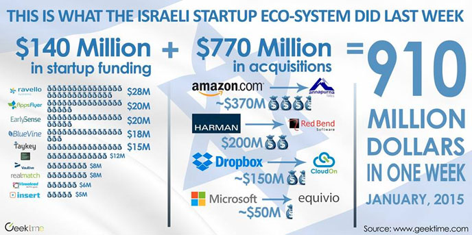As reported in Israel21C: Israeli startups raised $910 million through acquisitions and funding rounds in a seven-day period in January 2015.